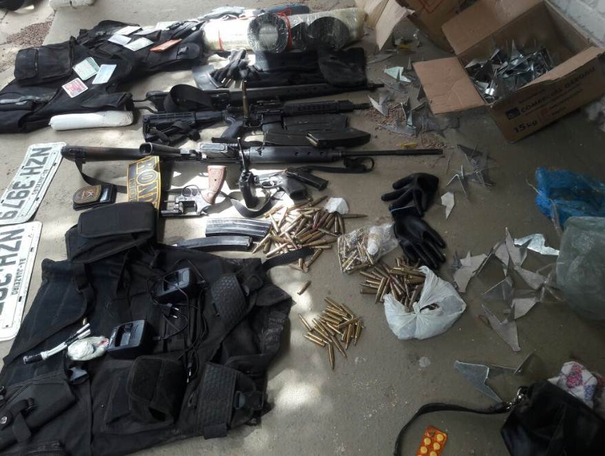 No imóvel foram apreendidos várias unidades de emulsão para explosivos com espoletas acopladas, três fuzis – dois de calibre 7,62 e um 556 – uma pistola 9 milímetros e dois revólveres, além de munições compatíveis com estes armamentos e de calibre 50. Foram ainda encontrados quatro coletes balísticos e 200 miguelitos (instrumentos pontiagudos com várias pontas utilizados para furar pneus e provocar atraso na chegada do reforço policial via terrestre) e diversas placas veiculares. (foto/divulgação)