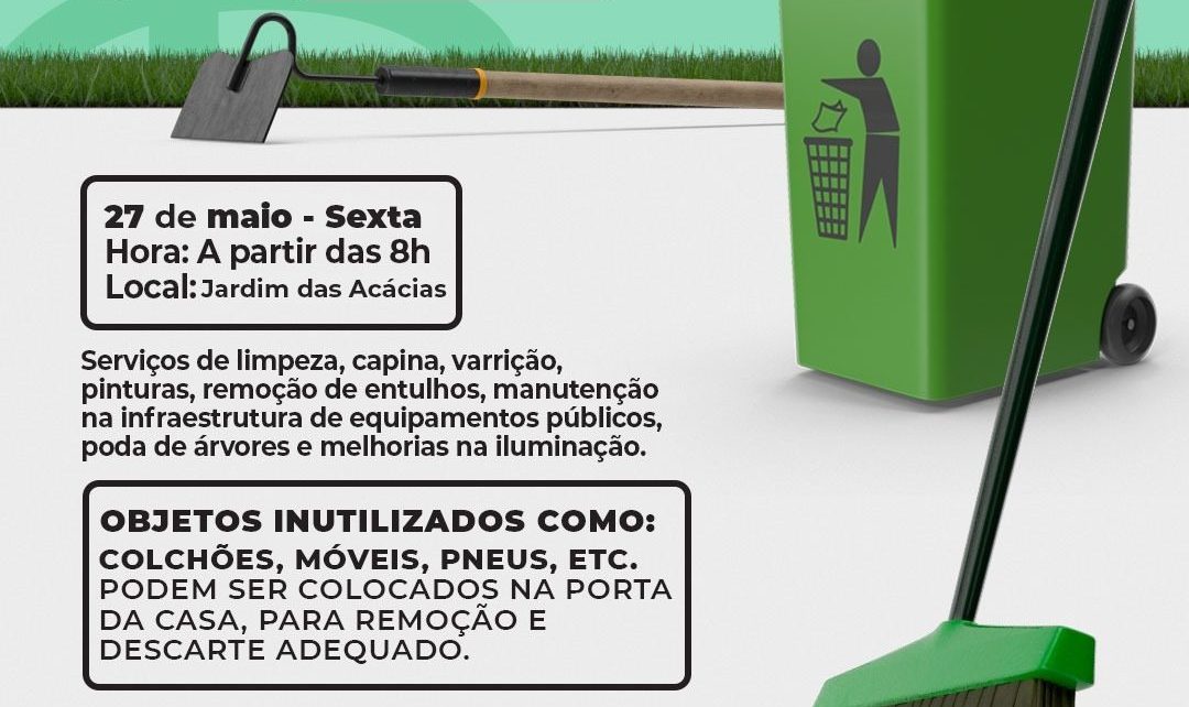 O bairro Jardim das Acácias vai receber o mutirão de limpeza e melhorias estruturantes do programa ‘Juazeiro da Gente’, nesta sexta-feira, 27 de maio. O trabalho intensificado visa melhorar além da limpeza, os espaços públicos com manutenção de vias, campos de futebol de várzea, poda de árvores, pinturas, remoção de entulho e melhoramento na iluminação pública.