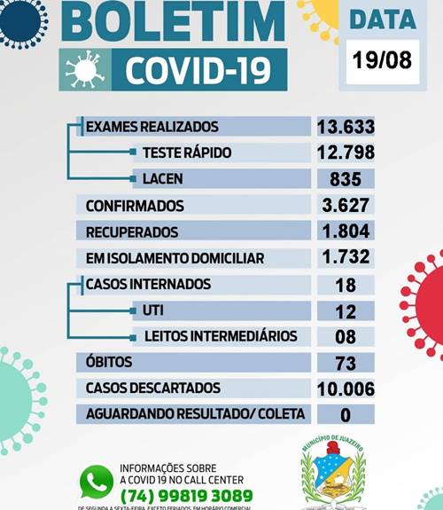 O município já realizou 13.833 exames; destes, 10.006 testes foram negativos para Covid-19. Dos 3.627 infectados, 1.971 são do sexo feminino, 1.656 são do sexo masculino e, destes, 235 são profissionais de saúde. Existem ainda 1.732 pacientes em isolamento domiciliar e 18 internados, sendo 12 em UTI e 6 em leitos intermediários. A lista completa de internamentos nas unidades de saúde de Juazeiro e da Rede PEBA (Pernambuco-Bahia) pode ser acessada pelo link.