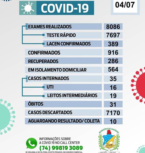 Por outro lado, Juazeiro teve hoje 11 recuperações de pacientes com a Covid 19, totalizando 286 curas clínicas.