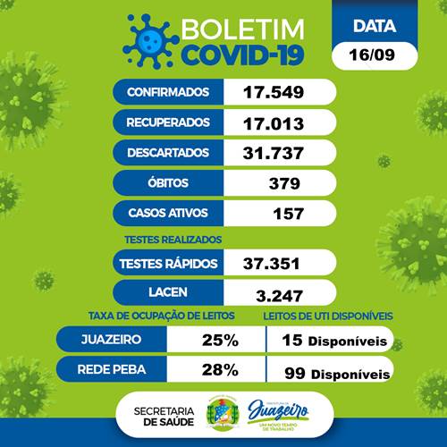 O levantamento aponta que o percentual de ocupação dos leitos de UTI para Juazeiro na rede PEBA (hospitais de Pernambuco e Bahia) é de 28%, com 99 leitos disponíveis. Somente em Juazeiro, a ocupação dos leitos de UTI para pacientes com Covid-19 é de 25%, com 15 disponíveis.