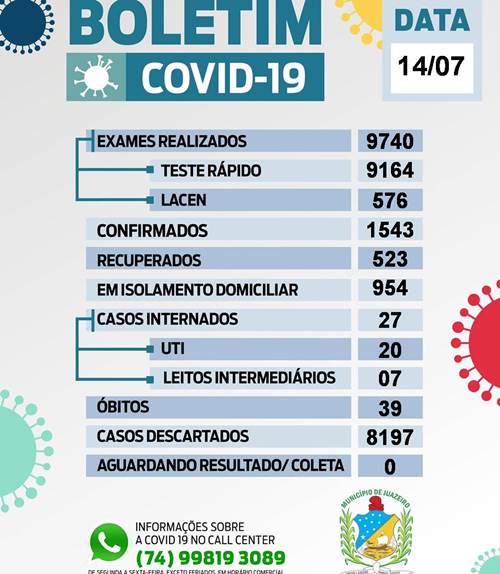 Já foram realizados 9.740 exames, com 8.197 descartados devido ao diagnóstico negativo para a Covid-19. Dos 1.543 casos, 859 são do sexo feminino, 684 do sexo masculino e, destes, 130 são profissionais de saúde. Juazeiro tem 954 pessoas em isolamento domiciliar e 27 internadas, sendo 20 em leitos de UTI e sete em leitos intermediários.