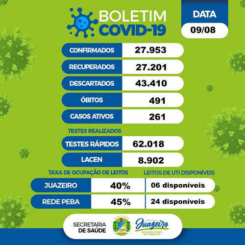 O percentual de ocupação dos leitos de UTI para Juazeiro na Rede PEBA (hospitais de Pernambuco e Bahia) é de 45%, com 24 leitos disponíveis. Somente em Juazeiro, 40% dos leitos de UTI para pacientes com Covid-19 estão ocupados, com 6 disponíveis.