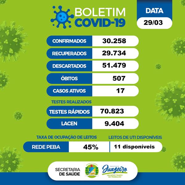 O município permanece com o total de 507 mortes causadas pela doença. Foram realizados, desde o início da pandemia, 70.823 testes rápidos em Juazeiro e 9.404 RT-PCR no Lacen-BA de Salvador.