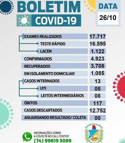 Entre os pacientes diagnosticados de hoje, 14 são do sexo masculino e 9 do sexo feminino, com idades de 3 a 74 anos, dos quais um é profissional de saúde. Todos estão em isolamento domiciliar. Os resultados foram obtidos através de 19 testes rápidos anticorpo e 4 testes rápidos antígeno. Juazeiro contabiliza até o momento 17.717 testes realizados, dos quais 12.752 foram considerados descartados. O município manteve os 117 óbitos pela doença registrados no boletim de ontem (25).