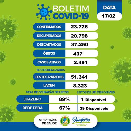 O percentual de ocupação dos leitos de UTI para Juazeiro na rede PEBA (hospitais de Pernambuco e Bahia) é de 67%, com 39 leitos disponíveis. Em Juazeiro, 89% dos leitos de UTI para pacientes com Covid-19 estão ocupados, com um disponível.
