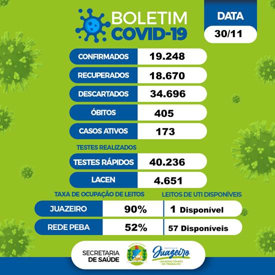O percentual de ocupação dos leitos de UTI para Juazeiro na Rede PEBA (hospitais de Pernambuco e Bahia) é de 52%, com 57 leitos disponíveis. Somente em Juazeiro, 90% dos leitos de UTI para pacientes com Covid-19 estão ocupados, com um disponível.