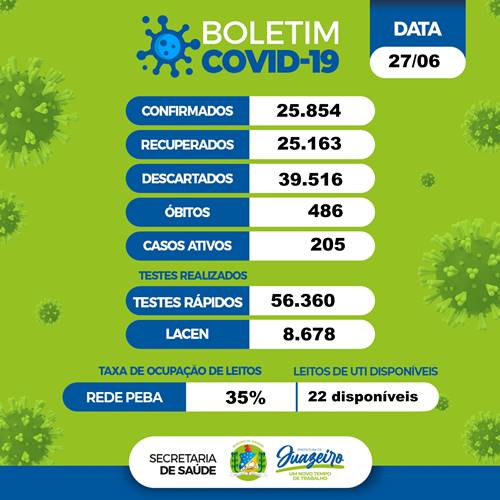 O percentual de ocupação dos leitos de UTI para Juazeiro na Rede PEBA (hospitais de Pernambuco e Bahia) é de 35%, com 22 leitos disponíveis.