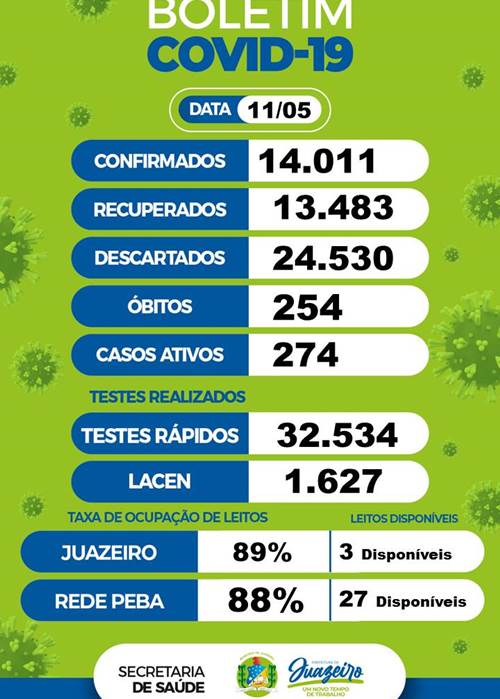 O percentual de ocupação dos leitos para Juazeiro na rede PEBA (Pernambuco-Bahia) é de 88%, com 27 leitos disponíveis. Somente em Juazeiro, 89% dos leitos de UTI para pacientes com Covid-19 estão ocupados, com 3 leitos disponíveis.