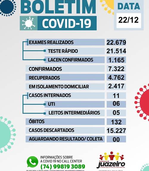 O boletim epidemiológico da Secretaria de Saúde (Sesau) registrou nesta terça-feira (22) em Juazeiro (BA) mais 85 casos confirmados do novo coronavírus (Covid-19) – uma taxa de 43% de testes positivos das 197 notificações realizadas no dia. Com essa atualização o número de infectados chega a 7.322, dos quais 4.762 já apresentaram curas clínicas. Juazeiro chega a 22.679 testes realizados, com 15.227 resultados negativos. Até o momento são 132 óbitos desde o início da pandemia.