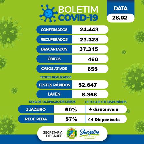O percentual de ocupação dos leitos de UTI para Juazeiro na Rede PEBA (hospitais de Pernambuco e Bahia) é de 57%, com 44 leitos disponíveis. Somente em Juazeiro, 60% dos leitos de UTI para pacientes com Covid-19 estão ocupados, com quatro disponíveis.