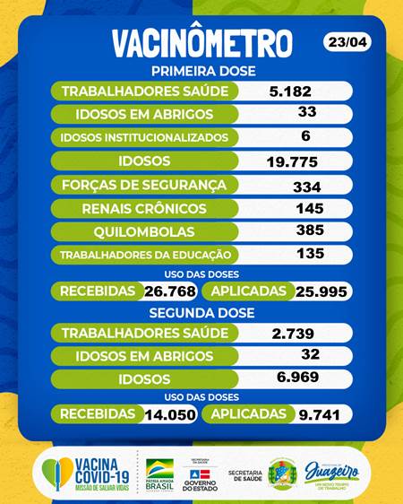 Como já tinha sido divulgado, a prefeitura recebeu no dia de hoje 2.760 doses de vacinas, sendo 1.680 doses da AstraZeneca e 1.080 doses da CoronaVac. Neste sábado (24) haverá um novo plantão de vacinação em diversos públicos nas zonas urbana e rural. Todas as informações sobre a Covid-19 em Juazeiro também estão disponíveis no site da prefeitura.