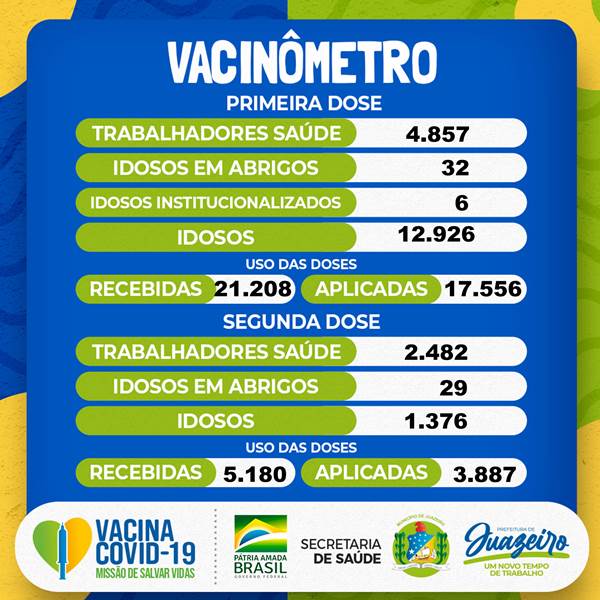 A Prefeitura de Juazeiro recebeu até agora, 21.208 doses de vacina contra o coronavírus. Aplicou 17.556, o que representa 82,78% do total. Para a segunda dose, foram recebidas 5.180, e aplicadas 3.887 doses,  o que representa 75,03%.