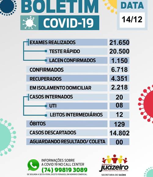No sábado (12) um homem de 73 anos faleceu em decorrência de complicações pela Covid-19 e não foi informado sobre comorbidades desse paciente. No domingo (13), outro idoso do sexo masculino, de 74 anos, que tinha como comorbidades linfoma e AVC, também não resistiu à doença. Ambos estavam internados no Hospital Regional de Juazeiro (HRJ). Com esses, o município chega a 129 óbitos desde o início da pandemia.