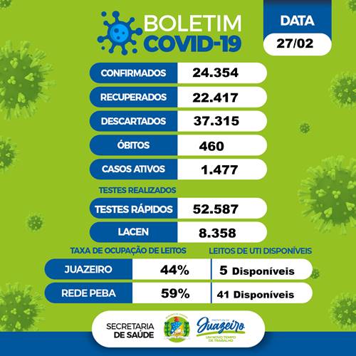 O percentual de ocupação dos leitos de UTI para Juazeiro na Rede PEBA (hospitais de Pernambuco e Bahia) é de 59%, com 41 leitos disponíveis. Em Juazeiro, 44% dos leitos de UTI para pacientes com Covid-19 estão ocupados, com cinco disponíveis.