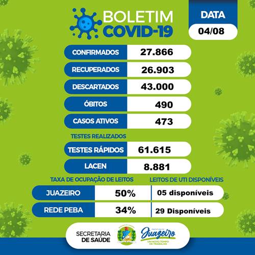 Juazeiro (BA) contabilizou 42 novos casos da Covid-19. A informação está no boletim epidemiológico da Secretaria de Saúde (Sesau) desta quinta-feira (4).