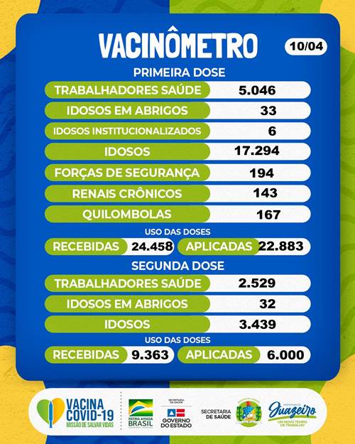 Neste sábado foram vacinados em primeira dose 478 idosos acima de 63 anos, e 719 em segunda dose. Como já informado, a Prefeitura de Juazeiro fará plantão de vacinação contra a Covid-19 na área urbana neste domingo (11), exclusivamente para vacinação em segunda dose.