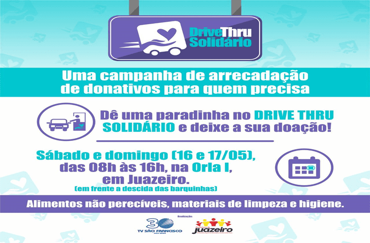 Acontecerá neste sábado (16) e domingo (17) o ‘Drive Thru Solidário’, em Juazeiro (BA). A ação é uma iniciativa da Rede Bahia, através da TV São Francisco em parceria com a prefeitura municipal. O evento também já aconteceu em cidades como Salvador e Feira de Santana. No norte do Estado, a primeira edição ocorreu em Paulo Afonso, no início de maio, e teve como resultado a arrecadação de mais de 1 tonelada de alimentos e 236 itens de itens de limpeza e higiene pessoal.
