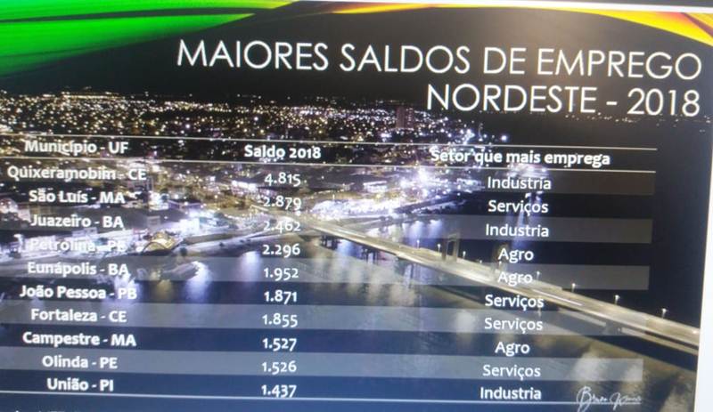 De acordo com o Boletim Caged do mês de junho, no saldo acumulado do ano de 2018 a cidade do norte baiano obteve 2.462 postos de trabalho, o que a coloca entre as três primeiras do Nordeste, ao lado de Quixeramobim (CE) e São Luiz (MA). Já Petrolina (PE) é a quarta cidade no nordeste e primeira em Pernambuco na lista, com um saldo de 2.296 postos de trabalho formais. O destaque é para a agropecuária.