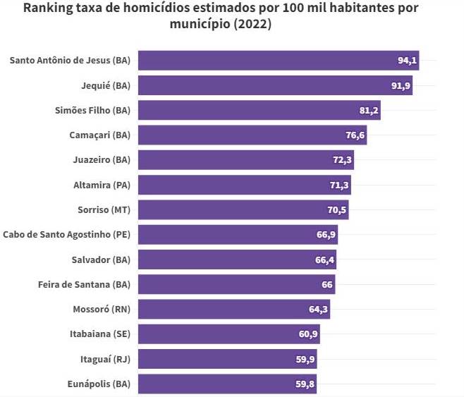 Bahia é o Estado com mais cidades entre as mais violentas do país — 7 das 10 com maior taxa de homicídios. O levantamento é do Atlas da Violência 2024, do Ipea (Instituto de Pesquisa Econômica Aplicada) junto ao Fórum Brasileiro de Segurança Pública, com dados de 2022. De acordo com o Atlas, são 16 cidades nordestinas entre as 20 mais violentas, sendo sete delas na Bahia.
