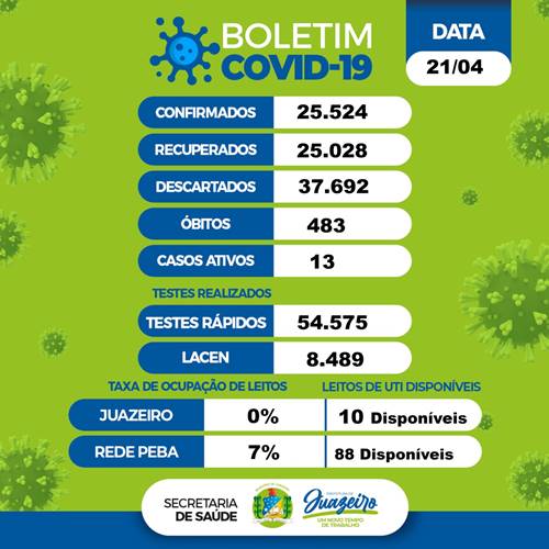 O percentual de ocupação dos leitos de UTI para Juazeiro na Rede PEBA (hospitais de Pernambuco e Bahia) é de 7%, com 88 leitos disponíveis. Em Juazeiro, os 10 leitos de UTI para pacientes com Covid-19 seguem disponíveis.
