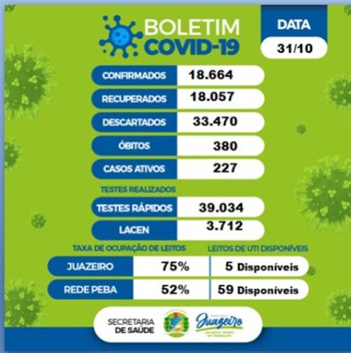 Juazeiro (BA) não teve casos registrados do novo coronavírus (Covid-19) neste domingo (31), de acordo com o boletim epidemiológico da Secretaria Municipal de Saúde (Sesau). Também não houve registro de óbitos, permanecendo as 380 mortes em decorrência da doença.