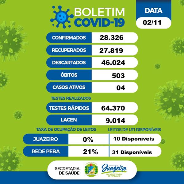 O percentual de ocupação dos leitos de UTI para Juazeiro na Rede PEBA (hospitais de Pernambuco e Bahia) é de 21%, com 31 disponíveis. Na cidade baiana, todos os 10 leitos de UTI para pacientes com Covid-19 estão desocupados.