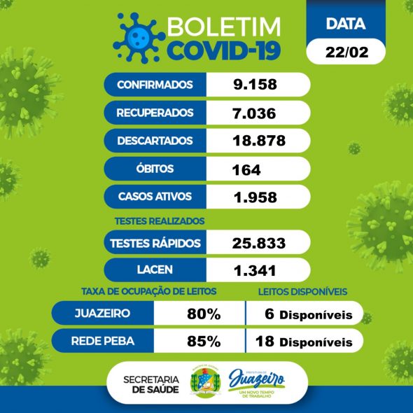 Com o óbito por Covid-19 do boletim desta segunda-feira, Juazeiro soma 164 registros. Faleceu uma mulher, de 31 anos, no Hospital Regional de Juazeiro (HRJ). Foram realizados desde o início da pandemia 25.833 testes rápidos pela prefeitura e 1.341 pelo Lacen, em Salvador.