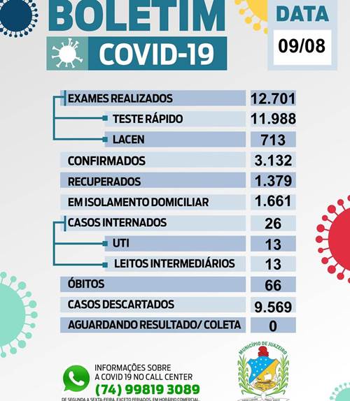 Já foram realizados 12.701 testes e, destes, 9.569 tiveram resultado negativo, sendo considerados descartados. Dos 3.132 casos confirmados, 1.704 são do sexo feminino e 1.428 do sexo masculino, sendo 214 profissionais de saúde. O município tem, até o momento, 66 óbitos ocasionados pela doença. Neste domingo 1.661 pacientes estão em isolamento domiciliar e 26 internados, sendo 13 em leitos de UTI e 13 em leitos intermediários.