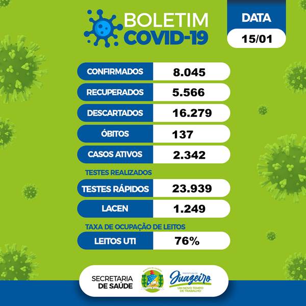 O boletim epidemiológico da Secretaria de Saúde de Juazeiro (BA) confirmou mais 26 casos positivos do novo coronavírus (Covid-19) nesta sexta-feira (15). Até o momento 8.045 pessoas foram infectadas desde o início da pandemia na cidade, das quais 5.566 já estão recuperadas. Casos descartados somam 16.279 e ativos, 2.342.
