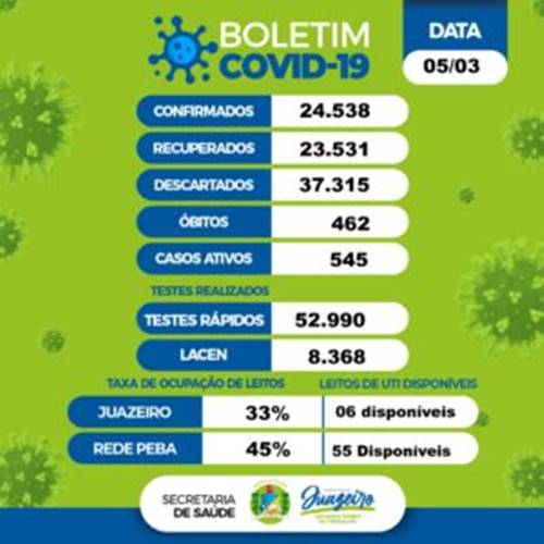 O boletim epidemiológico da Secretaria de Saúde (Sesau) também registrou um óbito por complicações da doença. Trata-se de um homem de 60 anos, que faleceu em um hospital particular de Juazeiro. Não há registro de comorbidade. Com isso, o município contabiliza 462 mortes.