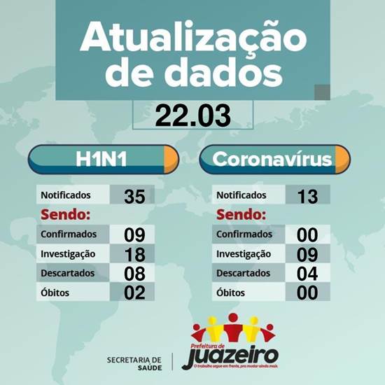 Em mais uma atualização dos números referentes ao H1N1 e do novo coronavírus (Covid-19), a Prefeitura de Juazeiro informou haver 35 notificações, sendo nove casos confirmados para H1N1 (incluindo dois óbitos), 18 em investigação e oito casos suspeitos que já foram descartados.