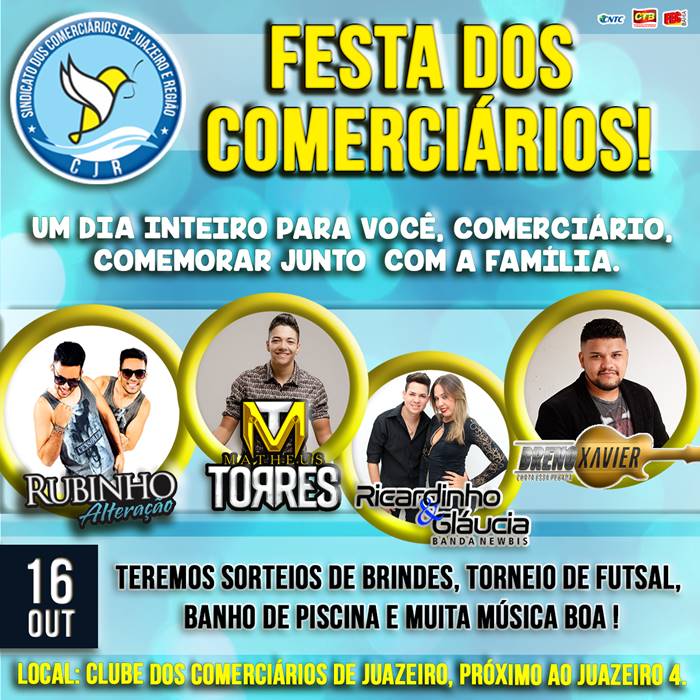 Em comemoração ao Dia do Comerciário, tradicionalmente festejado no dia 16 de outubro, o sindicato da categoria em Juazeiro (BA) preparou uma grande festa. O evento acontecerá no Clube de Lazer, situado no Bairro Malhada da Areia, a partir da 9h. Trabalhadores da cidade de Casa Nova (norte baiano) também farão parte do evento.