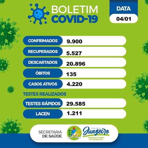 Já o número de pessoas recuperadas é de 5.527 – um acréscimo de mais 3 curas clínicas. A pasta registrou também um novo óbito nesta segunda. Trata-se de um homem de 52 anos, com histórico de outras doenças, que faleceu no Hospital Regional de Juazeiro (HRJ). Com essa atualização o município chegou a 135 óbitos pela Covid-19. Casos ativos da doença somam 4.220.