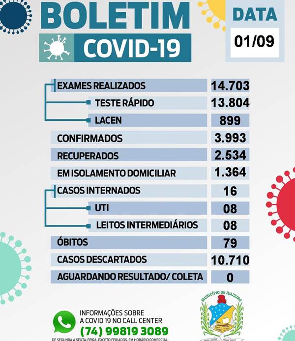 O município já realizou 14.703 testes com 10.710 resultados negativos, sendo considerados descartados. A Sesau informou ainda que já são 79 os óbitos pela doença. Dos 3.993 casos, 2.177 são do sexo feminino, 1.816 do sexo masculino e, destes, 249 são profissionais da saúde. Em isolamento estão 1.364 pessoas e 16 internadas, sendo 8 em UTI e 8 em leitos intermediários. A lista completa dos internamentos em Juazeiro e nas unidades da Rede PEBA (Pernambuco-Bahia) pode ser acessada pelo link.