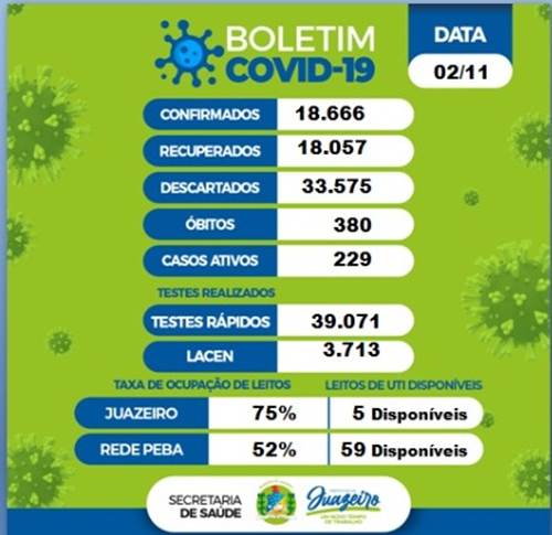 Sem registro de óbitos, Juazeiro contabiliza 380 mortes em decorrência da doença. Foram realizados, desde o início da pandemia, 39.071 testes rápidos pela prefeitura e 3.713 pelo Lacen-BA de Salvador.