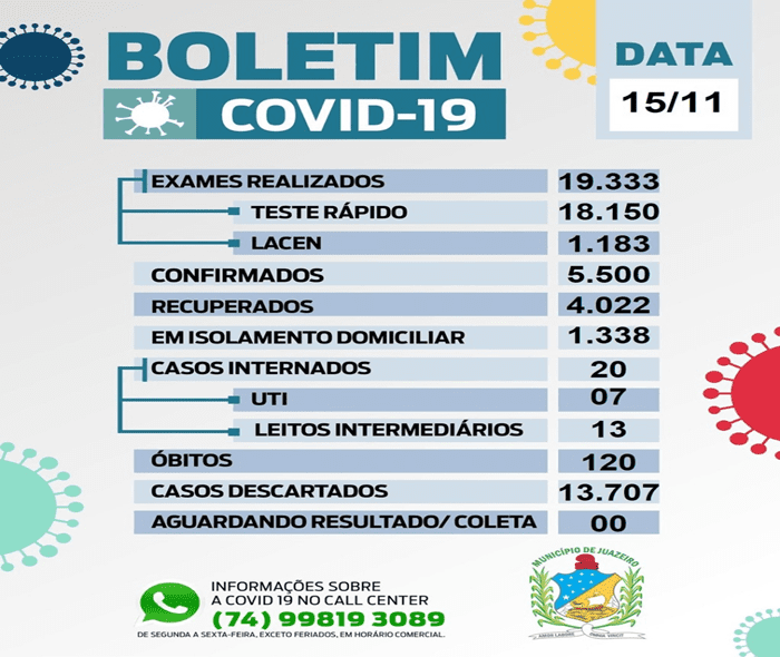 O boletim epidemiológico da Secretaria de Saúde (Sesau) de Juazeiro (BA) confirmou no dia de ontem (15) mais 3 casos positivos do novo coronavírus (Covid-19) em 9 notificações. Com essa atualização, Juazeiro atinge 19.333 pacientes testados, dos quais 5.500 tiveram resultados positivos e 13.707 negativos, considerados descartados. Curas clínicas no município totalizam 4.022, enquanto o número de óbitos se manteve em 120. Já os casos em isolamento domiciliar, com tratamento sem gravidade, subiram para 1.338 pessoas.