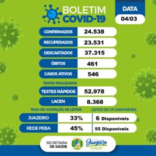 O percentual de ocupação dos leitos de UTI para Juazeiro na Rede PEBA (hospitais de Pernambuco e Bahia) é de 45%, com 55 leitos disponíveis. Em Juazeiro, 33% dos leitos de UTI para pacientes com Covid-19 estão ocupados, com seis disponíveis.