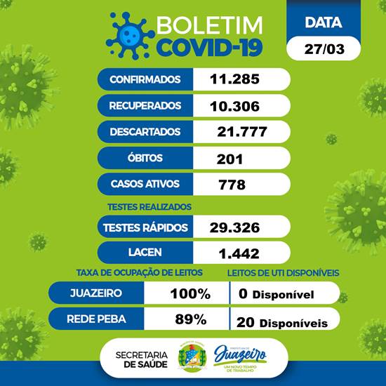 Dos internados regulados somente pela rede municipal, houve alteração nas últimas 24 horas. Na rede hospitalar, o percentual de ocupação dos leitos para Juazeiro em unidades da Rede PEBA (Pernambuco-Bahia) é de 89%, com 20 leitos disponíveis. Somente em Juazeiro, 100% dos leitos para pacientes com Covid-19 estão ocupados.