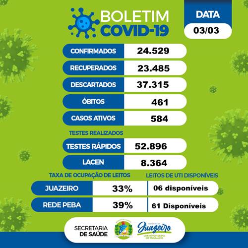A taxa de ocupação de leitos de UTI Covid-19 no território de Juazeiro está em 33%, com 6 leitos disponíveis. O percentual de ocupação dos leitos de UTI para Juazeiro na rede PEBA (hospitais de Pernambuco e Bahia) é de 39%, com 61 leitos disponíveis.