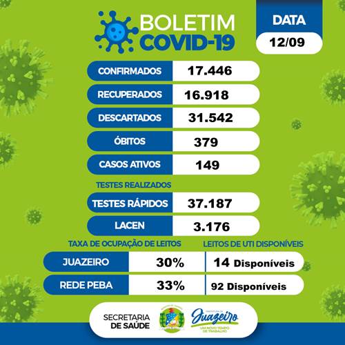 O percentual de ocupação dos leitos de UTI para Juazeiro na Rede PEBA (hospitais de Pernambuco e Bahia) é de 33%, com 92 leitos disponíveis. Somente em Juazeiro, 30% dos leitos de UTI para pacientes com Covid-19 estão ocupados, com 14 disponíveis.