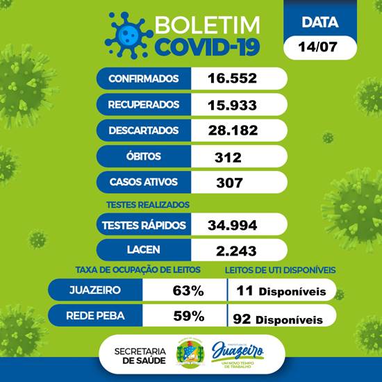 Juazeiro (BA) contabilizou mais 37 casos do novo coronavírus (Covid-19) nas últimas 24 horas. A informação está no boletim epidemiológico da Secretaria de Saúde (Sesau) desta quarta-feira (14).