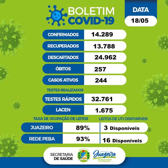 Na rede hospitalar, o percentual de ocupação dos leitos para Juazeiro na Rede PEBA (Pernambuco-Bahia) é de 93%, com 16 leitos disponíveis. Somente em Juazeiro, 89% dos leitos de UTI para pacientes com Covid-19 estão ocupados, com 3 disponíveis.