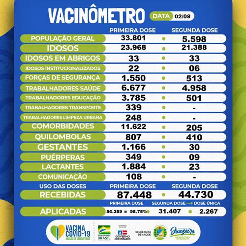 O percentual de ocupação dos leitos de UTI para Juazeiro na Rede PEBA (Pernambuco-Bahia) é de 30%, com 157 disponíveis. Somente em Juazeiro, 33% dos leitos de UTI para pacientes com Covid-19 estão ocupados, com 20 disponíveis.