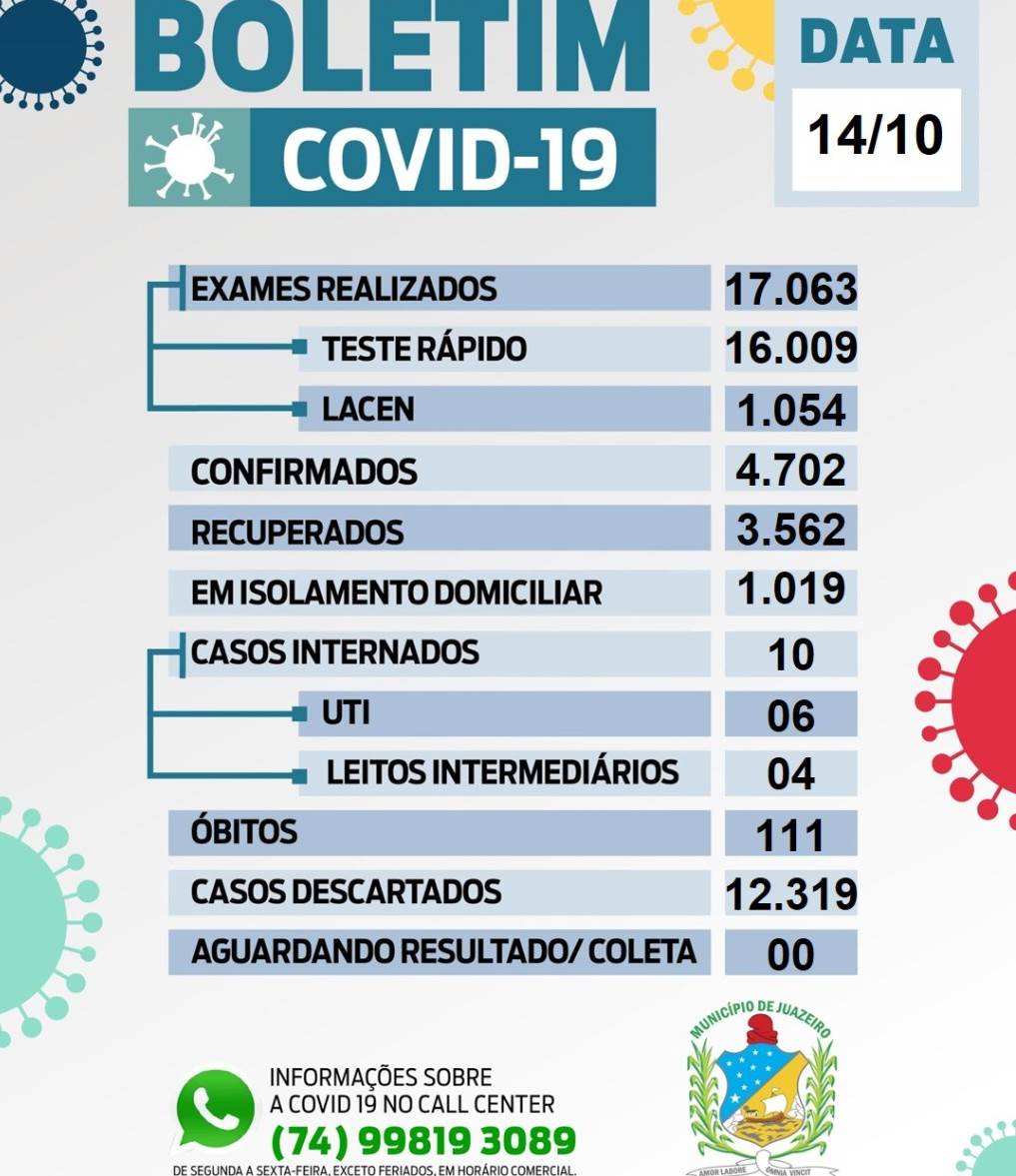 Todos estão sendo acompanhados e encontram-se em isolamento domiciliar. Com estes novos dados, agora são 4.702 pessoas confirmadas com Covid-19 e um total de 17.063 testes realizados.