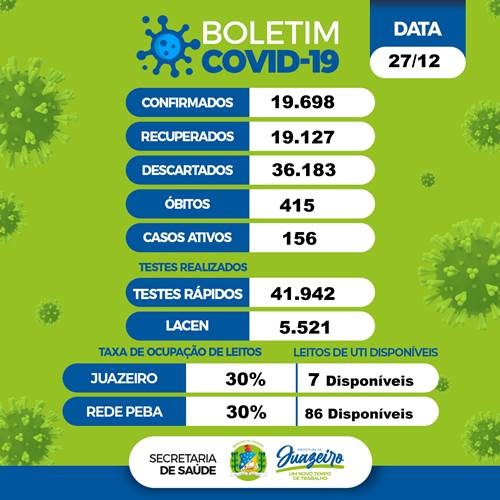 A taxa de ocupação de leitos de UTI para pacientes com Covid-19 em Juazeiro está em 30%. O município tem sete leitos disponíveis. Já o percentual de ocupação dos leitos de UTI para Juazeiro na Rede PEBA (hospitais de Pernambuco e Bahia) é de 30%, com 86 leitos disponíveis.
