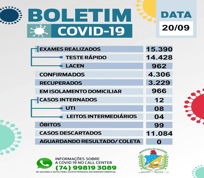 A Secretaria da Saúde (Sesau) de Juazeiro (BA) confirmou, neste domingo (20), que mais 5 pessoas testaram positivo para o novo coronavírus (Covid-19). Duas são do sexo feminino e 3 do sexo masculino, com idades entre 18 e 43 anos. Todos os resultados foram obtidos por meio de testes rápidos, estando todos em isolamento domiciliar. Com essa atualização nos dados, agora são 4.306 pessoas que já contraíram a doença no município. Até o momento ainda há 99 óbitos ocasionados pela Covid-19. Outras 3.229 pessoas estão clinicamente recuperadas.