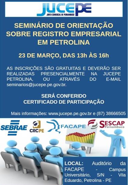 A sede regional da Junta Comercial de Pernambuco (Jucepe) promoverá o Seminário de Orientação sobre Registro Empresarial em Petrolina, no dia no próximo dia 23, das 13h às 16h, no auditório da Faculdade de Ciências Aplicadas e Sociais (Facape).