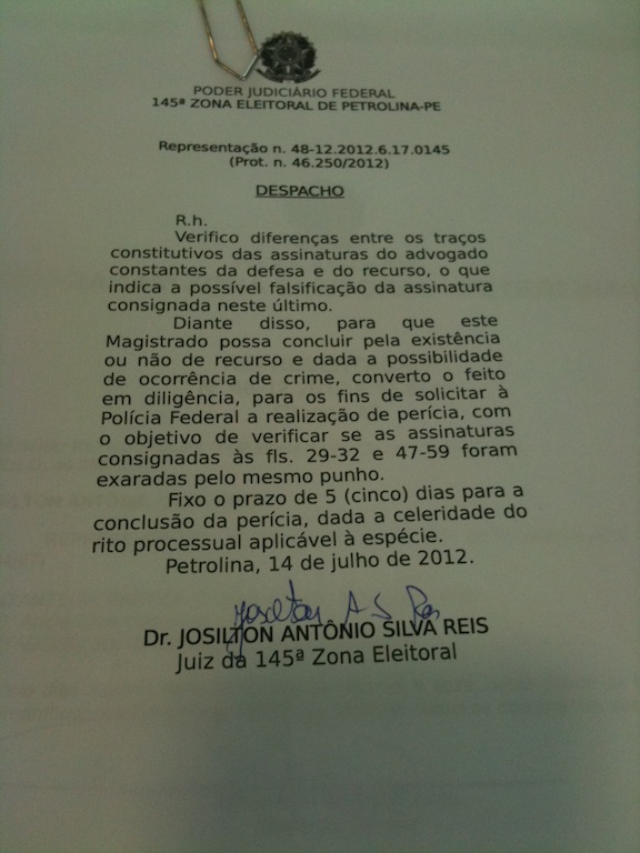 O juiz da 145ª Zona Eleitoral de Petrolina, Josilton Reis, responsável pela propaganda eleitoral na cidade, convocou a Polícia Federal para investigar possível falsificação de assinaturas em recurso interposto pelo prefeito e candidato à reeleição, Júlio Lossio (PMDB).