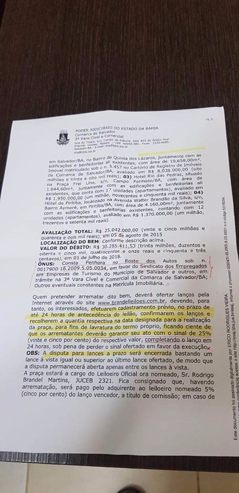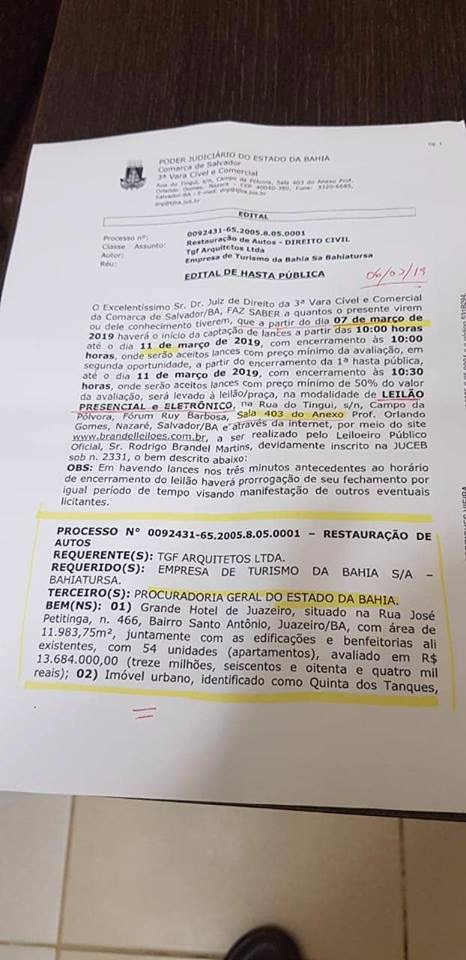 As ofertas podem ser feitas no site https://www.brandelleiloes.com.br/lotes/211-01-hotel-de-juazeiro/. O requerimento é da empresa TGF Arquitetos Ltda e a Bahiatursa fez a solicitação.